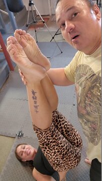 This athletic fitness trainer and gymnast, Linda Byrd, has some strong calves and shapely soles!